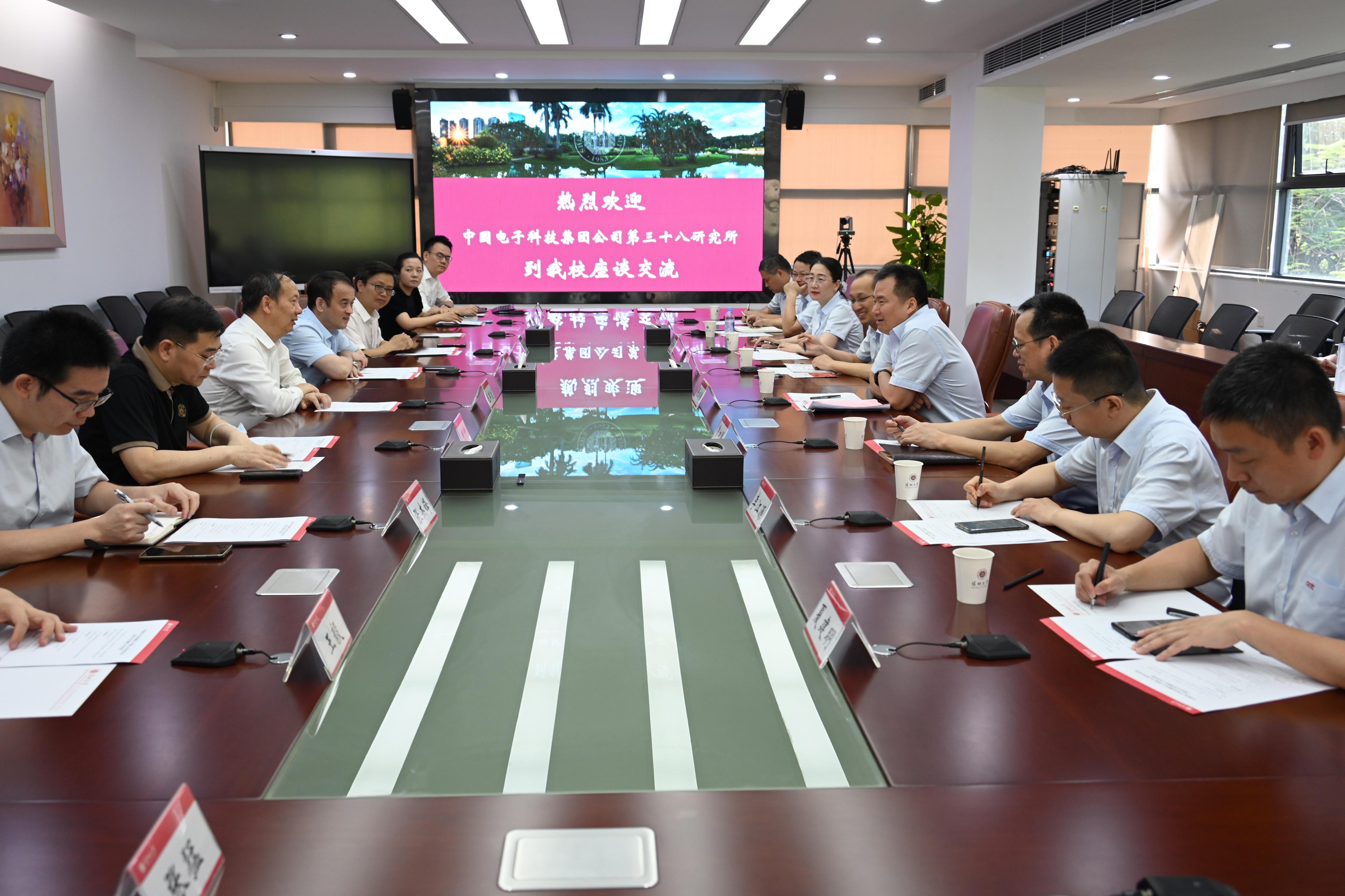 毛軍發對張成偉一行的到訪表示熱烈歡迎,并簡要介紹深圳大學的發展情況。他表示,深圳大學自1983年建校以來緊隨特區腳步,以“深圳速度”銳意改革、快速發展,成為一所特色鮮明、實力雄厚、在國內外具有良好聲譽和重要影響力的高水平綜合性大學,師資人才濟濟,科研成果豐碩,在國內外高校排行榜上名次不斷攀升,為深圳經濟特區培養輸送了三十多萬創新創業人才。毛軍發表示,深圳大學在重大科研和技術領域取得了一定成果,期待與中國電科38所深化產學研合作,在學科交叉、前沿研究等領域加深交流合作,為國家科技創新培養更多高質量人才。