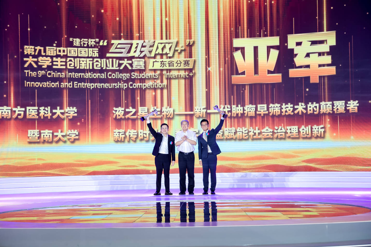 在校初賽、省復賽以及昨日緊張激烈、精彩紛呈的金獎爭奪賽后,評委專家組進行了會評,從高教主賽道、“青年紅色筑夢之旅”賽道、職教賽道共18個競賽小組的第1名中,評出了6個項目:南方醫科大學“液之星生物——新一代腫瘤早篩技術的顛覆者”、廣東工業大學“Eolink——國內最大的API在線管理服務平臺”、深圳大學“水利萬物——中國水利工程智能監測領航者”、華南理工大學“綠色氫能,啟動未來——高效低能耗催化電解水制氫技術領航者”、深圳職業技術學院“鉚大師-金屬連接智能裝備革新者”、暨南大學“薪傳時光:數字公益賦能社會治理創新”項目團隊按照抽簽順序出場,開啟本屆“互聯網+”廣東省分賽的冠軍爭奪。
