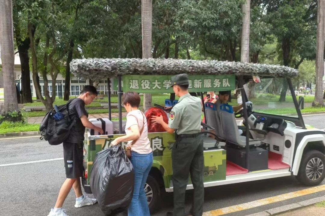 據悉,深圳大學武裝部從退役大學生中遴選出綜合能力較為突出的10位學生,組成退役大學生迎新服務隊,并將一輛電瓶車裝扮成“戰車”在元平體育場至宿舍樓區域定點定線接送新生,為新生提供入校引導、行李助運、答疑解惑等服務。退役在校的2022級體育教育學專業學生庾健朗表示:“作為一名退伍軍人和深大學生,我們希望能在迎新隊伍中發揮帶頭作用,盡自己所能給新生們帶來舒適的開學體驗,也為前來送行的家長們留下良好的印象。”