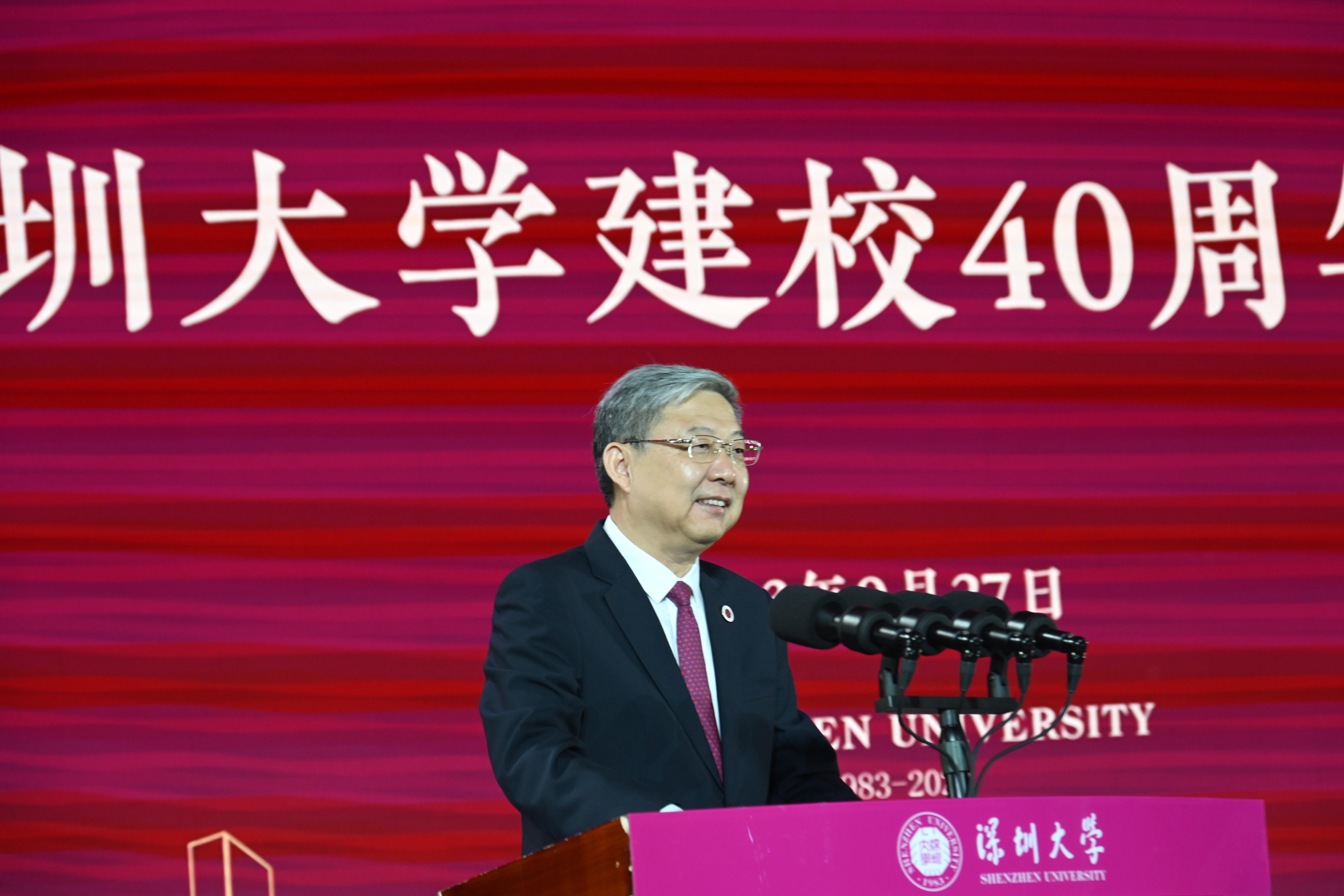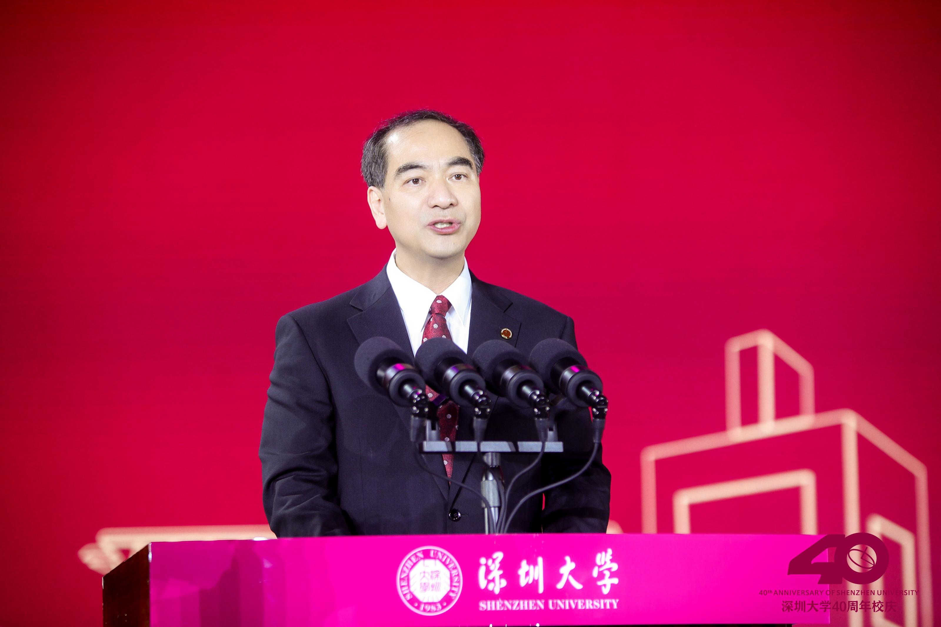覃偉中代表市委、市政府向深圳大學全體師生員工和廣大海內外校友表示熱烈祝賀。他說,深圳大學伴隨經濟特區而生,伴隨改革開放而興,40年來始終與深圳城市發展同頻共振、共同成長,走出了一條零起點新辦大學的高等教育創新發展之路,創造了高等教育發展的深圳速度、深圳質量。站在新的起點上,希望深圳大學深入學習貫徹習近平總書記關于高等教育的重要論述,全面貫徹黨的教育方針,牢牢把握社會主義辦學方向,落實立德樹人根本任務,堅持走高水平、特色化、內涵式發展道路,永葆改革創新的銳氣、爭創一流的志氣、時不我待的朝氣,為服務國家戰略和城市發展培養更多高素質、創新型人才,產出更多高質量、引領性的科研成果,努力為建設粵港澳大灣區和深圳先行示范區提供有力支撐,在建設教育強國、科技強國、人才強國新征程中展現新擔當新作為。市委、市政府將一如既往全力支持深圳大學改革創新發展,辦出水平、辦出特色、辦出影響力,攜手為我國高等教育事業發展、為推進中國式現代化建設作出更大貢獻。