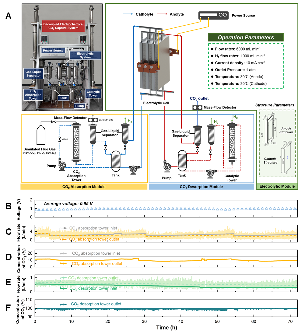 圖3:CO2的電化學碳捕集原理樣機與性能驗證。A、原理樣機與工藝流程;B、穩定性測試;C、吸收塔進出口流量;D、吸收塔進出口CO2濃度;E、解吸塔進出口流量;F、解吸塔出口CO2濃度。